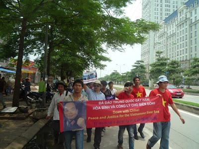 Khoảng 11h05, Nguyễn Xuân Diện (không bị hốt lên xe) tới, và gặp mặt anh chị em, cùng chụp ảnh lưu niệm. Ra khỏi trụ sở công an, đoàn tiếp tục biểu tình, hô vang các khẩu hiệu Đả Đảo Nhà cầm quyền Bắc Kinh, Bảo vệ Ngư dân Việt Nam, Bảo vệ Tổ quốc, Hoàng Sa - Trường Sa là của Việt Nam, Không được bắt, giết cướp tài sản của ngư dân Việt Nam....